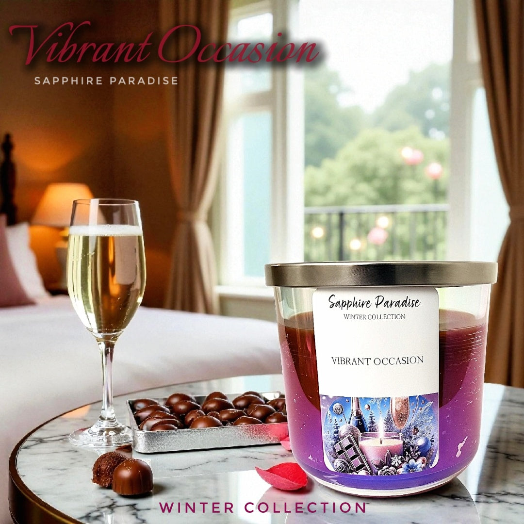 Celebrate life’s special moments with our Vibrant Occasion scented candle, crafted to bring a sense of elegance and joy to any space. This luxurious fragrance opens with bright Bergamot and the effervescent sparkle of Champagne, setting a festive tone. Delicate Orchid and Jasmine blend with the rich, romantic scent of Bulgarian Rose, creating a captivating floral heart. Warm Amber and sensual White Musk add depth, while a dose of Chocolate lends an irresistible sweetness. Vibrant Occasion is perfect for creating a sophisticated, enchanting atmosphere in your home.